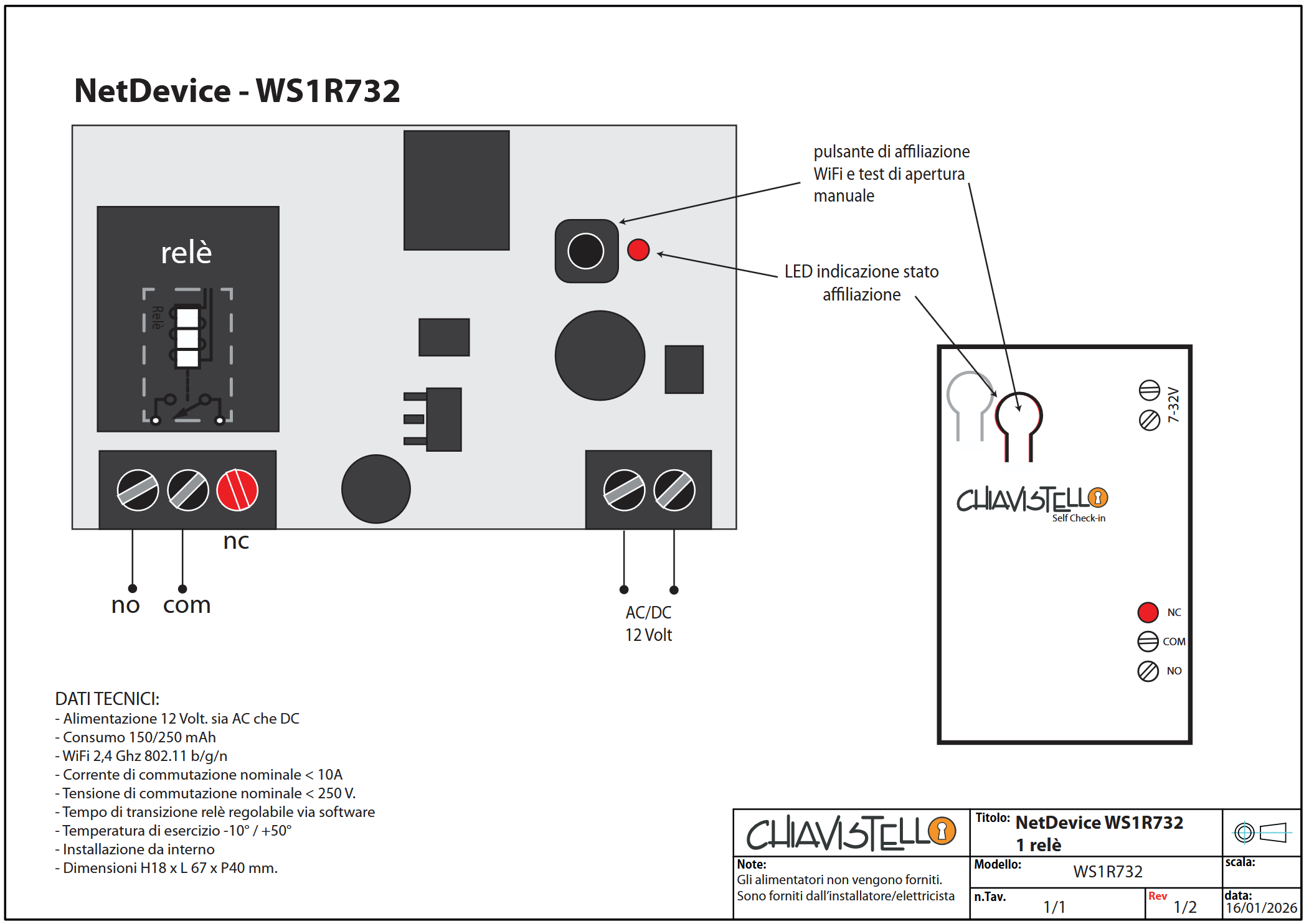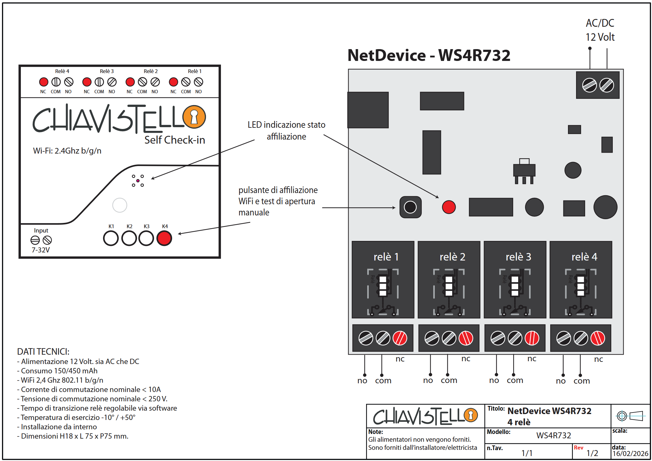 L'hardware di Chiavistello sono i "NetDevice": schede relè a contatto pulito collegate in WiFi. Il NetDevice consente l'apertura in remoto di qualsiasi serratura, incontri elettrici, serrature motorizzate, cilindri motorizzati, sbarre automatiche, serrature magnetiche, etc.